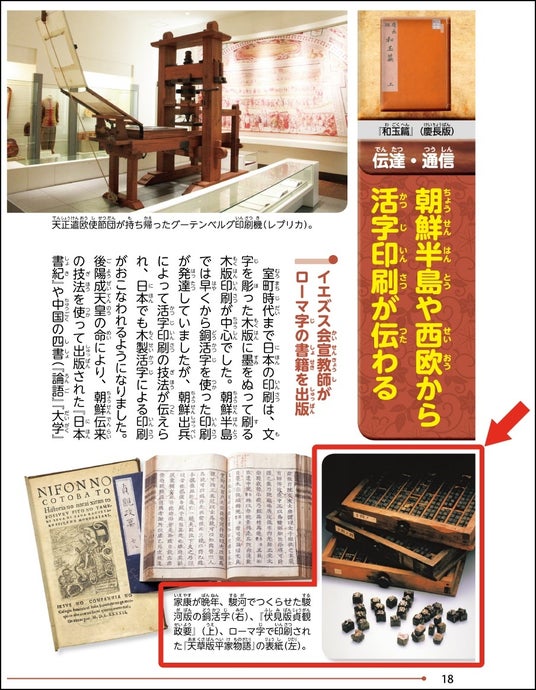 実際に共通テストに出た銅活字の写真は、講談社の「日本の歴史」11巻の資料ページP18にカラーで掲載されている「家康が晩年、駿河でつくらせた駿河版の銅活字」と全く同じもの。共通テストの「(活字印刷の技術をもたらしたのは)イエズス会の宣教師か、オランダ東インド会社の社員か」という選択肢について、「日本の歴史」では「イエズス会の宣教師がローマ字の書籍を出版」と書かれているので、この資料ページを読んでいれば容易に正解できることになります。
