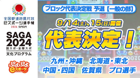 株式会社セガは、ジャパン・eスポーツ・プロライセンス認定タイトルである、対戦アクションパズルゲーム「ぷよぷよ」シリーズについて、2024年9月14日(土)、9月15日(日)に開催された「全国都道府県対抗eスポーツ選手権 2024 SAGA ぷよぷよ部門 一般の部」の九州・沖縄、北海道・東北、中国・四国、佐賀、プロ選手ブロックの「ブロック代表決定戦 予選」の大会結果をお知らせいたします。