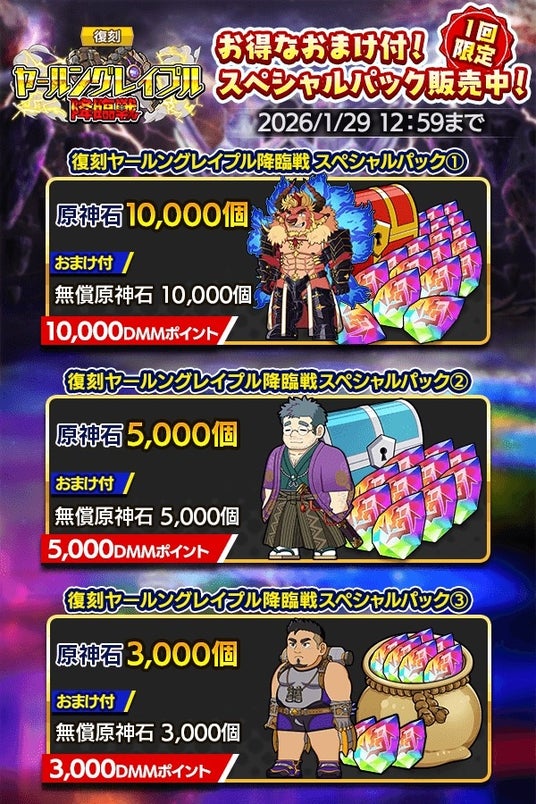 「復刻 ヤールングレイプル降臨戦」開催、「トゥストラ」の登場を記念して原神石に加え、育成素材が入手できてお得な「降臨戦「トゥストラ」育成促進パック」と、「復刻ヤールングレイプル降臨戦スペシャルパック」も3種登場!こちらも是非お見逃しなく!