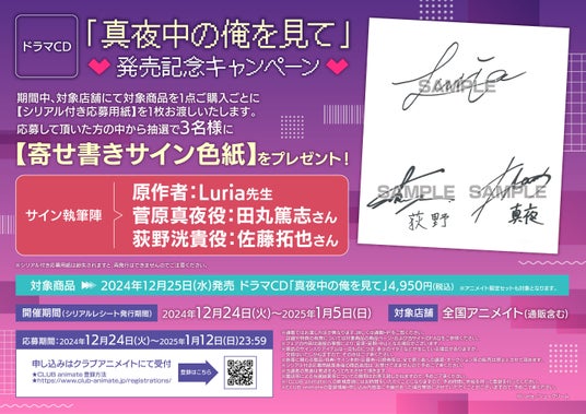 期間中、アニメイトでドラマCDをご購入いただいたお客様の中から抽選で3名様に【原作者:Luria先生、菅原真夜役:田丸篤志さん、荻野洸貴役:佐藤拓也さん】の寄せ書きサイン色紙をプレゼント。
