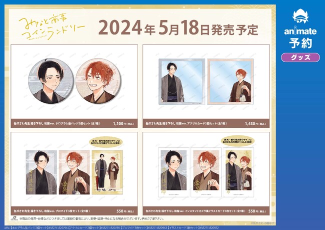 2024年2月22日(木)~2024年3月10日(日)の期間中、アニメイト通販にて『みなと商事コインランドリー』の対象キャラクターグッズをご予約1,100円(税込)毎に、通販事前予約キャンペーン限定特典「ポストカード(全6種)」を1枚プレゼント!