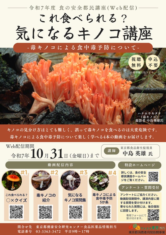 今回の都民講座では、毒キノコによる食中毒予防について楽しく学べる4本の動画をお届けします。ぜひご視聴ください。