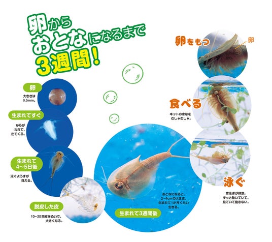 付属のカブトエビの休眠卵(耐久卵)を水に入れると2~3日でふ化し、約3週間でおとな(成体)になります。生命誕生の感動を味わえ、「生きた化石」とも呼ばれる貴重な生き物を観察・研究することで、生命の神秘と不思議をまるごと体験することができます。