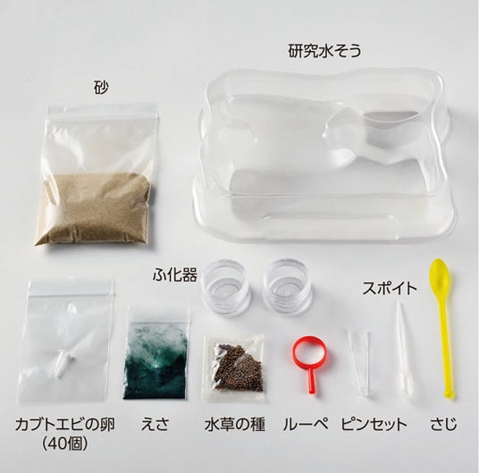 カブトエビの卵(カプセル入り)、カブトエビ専用の水そう、えさ(藻)、水草の種、底砂、ふ化器(標本ケースと兼用)、観察用ルーペ、ピンセット、スポイトが入った充実のセット