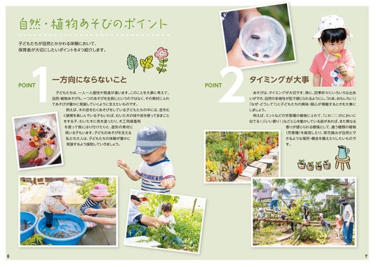 身近な自然の中で楽しめる「植物あそび」「栽培」「製作」のアイディアを、春・夏・秋・冬・一年中に分けて110案、紹介。子どもの五感を豊かにはぐくむあそびがいっぱいです。子どもと楽しみたい植物図鑑、園の自然環境づくりのヒント付き!