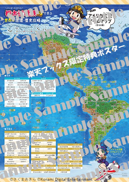 書籍通販サイト「楽天ブックス」で購入された方限定で、『桃鉄ワールド』のアメリカ大陸部分のゲームマップとリアルマップをプリントした両面マップポスターがついてきます。