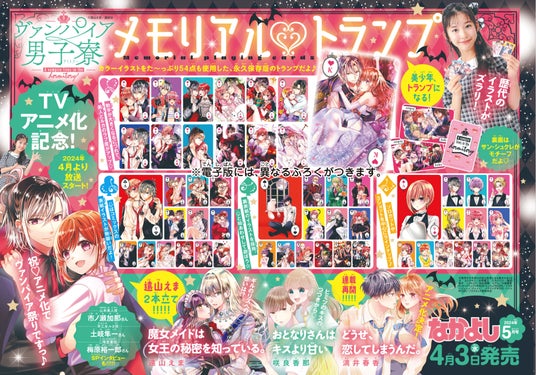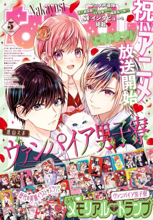 なかよし5月号は、巻頭カラー『ヴァンパイア男子寮』とセンターカラー『魔女メイドは女王の秘密を知っている。』が2本立てで読めちゃう春の特大「とおやまつり」号♪ TVアニメメイン声優2人のスペシャルインタビューも掲載!