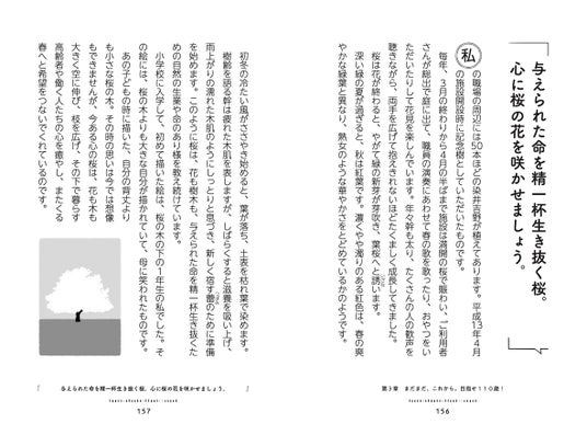 「めざせ110歳!」を標榜し、93歳になる今でも元気な著者が実践している、毎日を明るく楽しく生きていくための心得帖、著者初の書き下ろしの一冊です。老若男女、様々な方々が、周りの人々と助け合いながら、ともに生きていくためのコツがたっぷり詰まっています。著者である細井恵美子氏は、終戦直後に看護師養成所に入所して以降、70年以上、医療・介護の現場に立ち続けています。90歳を超えても、「朝起きて、働きたくないと思う日はない」という生涯現役の精神、「介護とは、その人の人生を看る仕事」という真摯な職務への姿勢で、数多くのメディアから注目されています。「普通に暮らすことができれば、それが一番のしあわせです」「与えられた命を精一杯生き抜く桜。あなたの心に桜の花を咲かせましょう」「忘れられてもかまわない、気にしない。明日もまた会えることを楽しみに」等々……本書は著者がこれまでに培ってきた「110歳まで元気に生きるための言葉、思想」が数多く掲載されています。