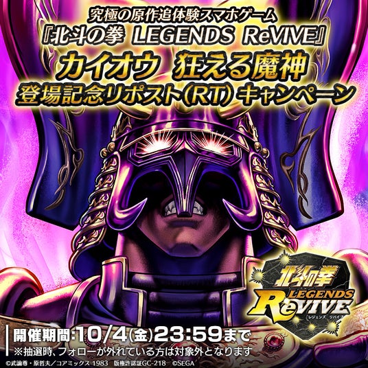 200万ダウンロードを突破した、伝説的漫画『北斗の拳』(原作:武論尊・漫画:原哲夫)を題材としたスマートフォン向けゲームアプリ『北斗の拳 LEGENDS ReVIVE (以下、「北斗リバイブ」)』に、「カイオウ 狂える魔神」が新拳士として2024年9月30日(月)より実施される“5周年ラストスパート 世紀末ランキングガチャ”に登場します。