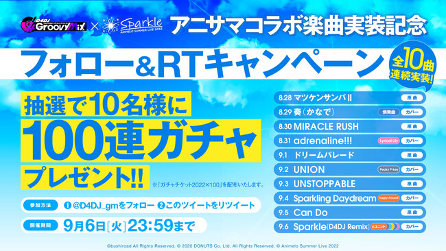 株式会社ブシロード(本社:東京都中野区、代表取締役社長:木谷高明)は、株式会社DONUTS(本社:東京都渋谷区、代表取締役:西村啓成)と共同開発のスマートフォン向けリズムゲーム「D4DJ Groovy Mix」(以下グルミク)にて、8月26日(金)、8月27日(土)、8月28日(日)に開催されたアニソンイベント 「Animelo Summer Live 2022 -Sparkle- (アニサマ)」とのコラボ楽曲として「Can Do」原曲を追加いたしました。他、アニサマコラボ楽曲実装の記念を記念してフォロー&RTキャンペーンの開催や今後のアニサマコラボ楽曲実装スケジュールをお知らせいたします。