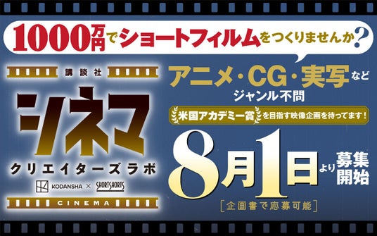 「講談社シネマクリエイターズラボ」は、映像企画を世界公募、優秀企画に賞金各1000万円をお支払いして担当編集者が受賞クリエイターと一緒にショートフィルムを制作。