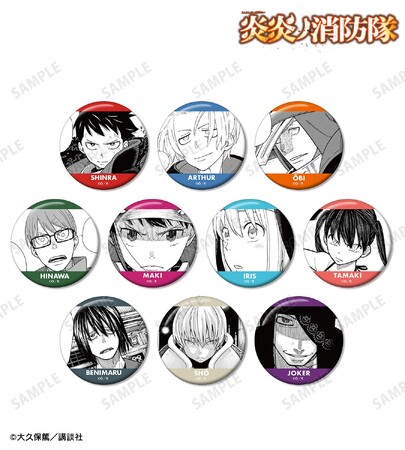 森羅 日下部、アーサー・ボイル、秋樽 桜備、武久 火縄、茉希 尾瀬、アイリス、環 古達、新門 紅丸、象 日下部、ジョーカーの原作での印象的なシーンを缶バッジに仕上げました。