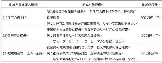東京都及び(公財)東京しごと財団では、従業員の住宅・食事・健康に関する福利厚生の充実による従業員のES(Employee Satisfaction 社員満足度)の向上を通じて、若手人材の採用・定着を図る都内中小企業等の取組をサポートする事業を実施しています。