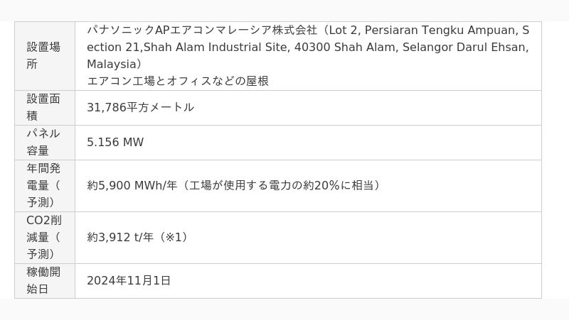 パナソニック株式会社 空質空調社(以下、パナソニック)は、工場のCO2排出量実質ゼロ化に向けた取り組みの一環として、マレーシアのパナソニックAPエアコンマレーシア株式会社(以下、PAPAMY)の工場に、発電容量5.2 MW規模の太陽光発電システムを導入しました。この規模はパナソニックグループ内で最大級となり、稼働による年間発電量は約5,900 MWh/年、CO2排出量は年間約3,912 t削減される見込みです。この取り組みにより、PAPAMYのエアコン工場とオフィスなどを含む全ての使用電力の約20%を賄います。
