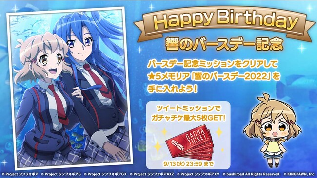 株式会社ブシロード(本社:東京都中野区、代表取締役社長:木谷高明)と株式会社キングポーン(本社:東京都中央区、代表取締役社長:清水祐一)は、好評配信中のスマートフォン向けゲームアプリ「戦姫絶唱シンフォギアXD UNLIMITED」にて、立花響の誕生日を記念したキャンペーンを2022年9月13日(火)0:00より配信開始したことをお知らせします。