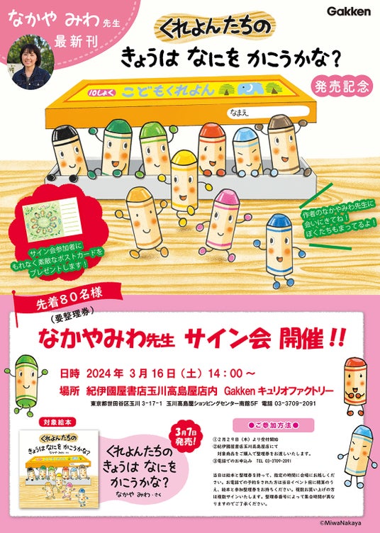 株式会社 学研ホールディングス(東京・品川/代表取締役社長:宮原博昭)のグループ会社、株式会社 Gakken(東京・品川/代表取締役社長:五郎丸徹)は、2024年3月16日(土)に『くれよんたちの きょうはなにをかこうかな?』刊行記念のサイン会を開催いたしました。