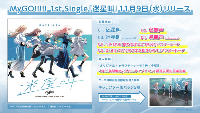 カップリングには本公演で初公開となった「名無声」が、ボイスドラマトラックには1st LIVE「僕たちはここで叫ぶ」、2nd LIVE「そのままを抱きしめて」のアフタートークが収録されることが決定しました。さらに、初回生産分には2023年に開催されるMyGO!!!!!ライブイベントの最速先行抽選申込券が封入されます。