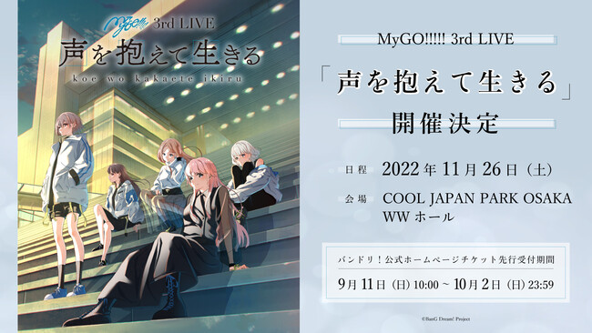 2022年11月26日(土)に、COOL JAPAN OSAKA WWホールにて、初の大阪での公演となるMyGO!!!!! 3rd LIVE「声を抱えて生きる」の開催が決定しました。バンドリ!公式ホームページでのチケット先行受付は9月11日(日) 10:00より開始となります。