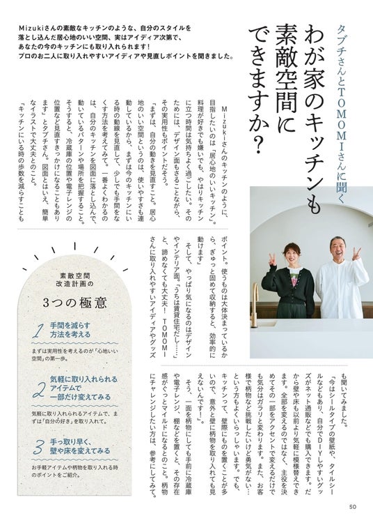 リノベーションのプロと一緒に、使っていない倉庫をゼロから作り直した、本邦初公開の新キッチン。誰もが憧れる【自分だけの素敵キッチン】の作りかたを、Mizukiさんのキッチンを手掛けたデザイナーのお二人から伝授。色や柄の取り入れ方、自宅でもマネできるコツや見せ方のアドバイスも。