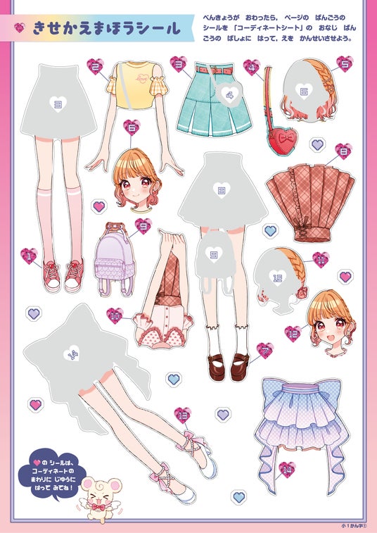▲ドリルの問題を解いたら、「きせかえまほうシール」(左)を「コーディネートシート」(右)に貼って、コーデを完成させていく。