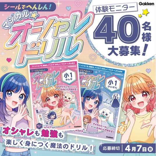株式会社 学研ホールディングス(東京・品川/代表取締役社長:宮原博昭)のグループ会社、株式会社 Gakken(東京・品川/代表取締役社長:五郎丸徹)は、小学1・2年生向けの漢字・計算ドリル『マジカル☆オシャレドリル』シリーズの発売にあわせ、2024年3月28日(木)より、体験モニターを40名募集いたします。応募締め切りは4月7日(日)です。