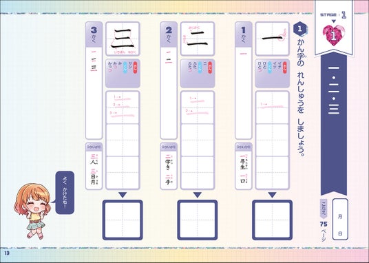 ▲「小1かん字」の学習ページ。子どもに馴染みのある言葉を使いつつ、多様な読みや熟語の書きなどにもチャレンジできる内容になっています。