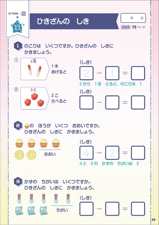 学習ページは1回分が表・裏の2ページ構成で、内容も基礎~標準レベルになっているので、集中力に不安のあるお子さんや、本格的な学習が初めてのお子さんでも、一人で無理なく進められます。