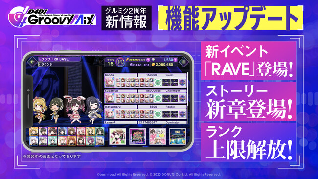株式会社ブシロード(本社:東京都中野区、代表取締役社長:木谷高明)は、株式会社DONUTS(本社:東京都渋谷区、代表取締役:西村啓成)と共同開発のスマートフォン向けリズムゲーム「D4DJ Groovy Mix」(以下グルミク)にて、「NieR:Automata」とのコラボイベントに向け「グルミク×『NieR:Automata』コラボ記念配信」を行いました。配信ではカードイラストや実装楽曲のほかコラボに関する情報解禁をいたしました。さらにグルミク2周年に関する情報を発表いたしました。