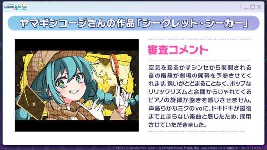 「一緒に作ろう!第24回楽曲コンテストプロセカNEXT」の採用作品が、「シークレット・シーカー」(作詞・作曲:ヤマギシコージ)、「夏に透明」(作詞・作曲:Twinfield)に決定いたしました。採用作品は今後リズムゲーム楽曲として追加予定です。