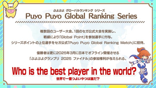 ランキングの上位選手が、2025年1月末に開催予定のセガ公式大会「Puyo Puyo Global Ranking Match」に進出し、優勝者には賞金と「ワールドチャンピオンユニフォーム」を授与します。また、2025年3月に開催されるセガ公式「ぷよぷよグランプリ 2025 ファイナル」に招待いたします。