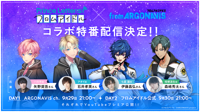 株式会社ブシロード(本社:東京都中野区、代表取締役社長:木谷高明)のグループ会社にあたる株式会社アルゴナビス(本社:東京都中野区、代表取締役社長:木谷高明)とフロムアイドル運営事務局(松竹株式会社)は、Prince Letter(s)! フロムアイドル×from ARGONAVISコラボ特番【お互い「フロム」じゃん!仲良くなろうよ!特番】について詳細情報を発表致しました。