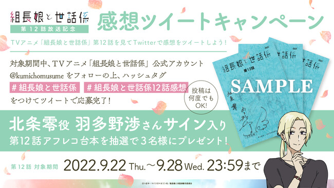 TVアニメ『組長娘と世話係』第12話放送を記念して、北条零役 羽多野渉さんサイン入り第12話台本を、3名様にプレゼント致します。