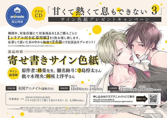ドラマCD「甘くて熱くて息もできない 3」の発売を記念して、抽選プレゼント企画を実施いたします!