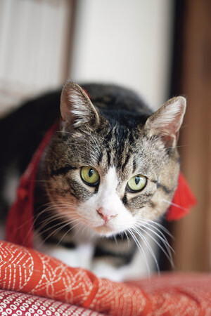 撮影は大河ドラマ『光る君へ』の世界観を踏襲し、日本家屋のスタジオで行いました。縁側でリラックスしたり、スタジオのプロップを用いてポージングをとったり……マネージャーさんの身振り手振りに応じて、レンズを見つめる愛らしい表情から憂いを帯びた目線外しまで、シーンごとにさまざまな表情を見せてくれました。どアップの表情、寝転がる際にふいに見せてくれた肉球、眠くなりうとうとする姿など、大河ドラマでは見られないニモさんの素顔をとらえました。