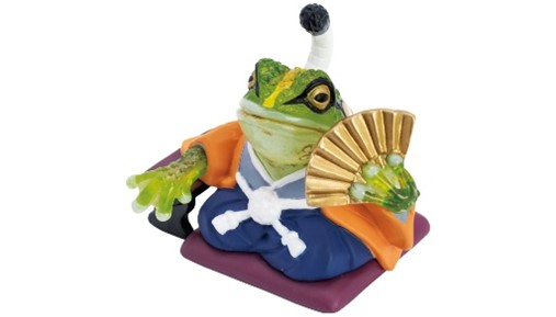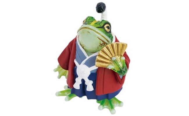 色とりどりの羽織や風情ある小物を身に着けた、威厳あふれる姿の「殿様がえる」。