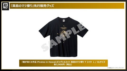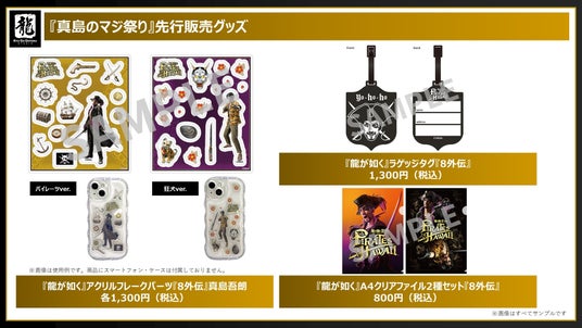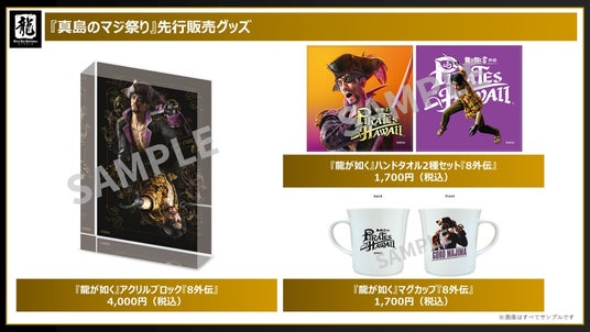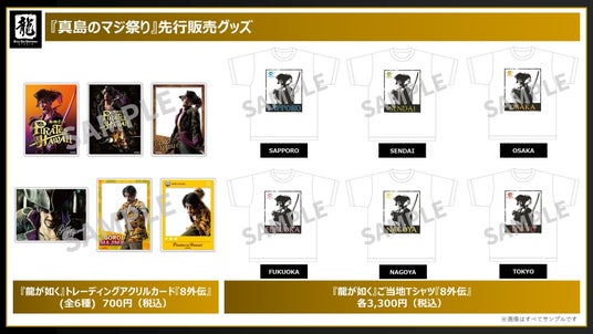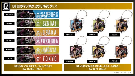 「真島のマジ祭り」開催都市名の入った、地域限定のご当地Tシャツ・マグカップ・キーホルダーはじめ、『龍が如く8外伝』のビジュアルを使用したアイテムを先行販売します。