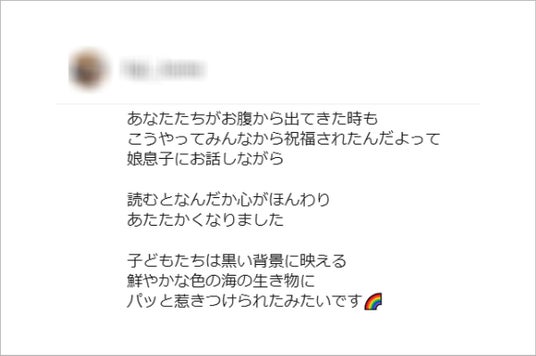 編集部には発売直後から、この絵本を読んだママたちの感動コメントや、こどもたちが興味津々に絵本の世界を楽しんでいる様子が続々と報告されています。その一部をご紹介しましょう。