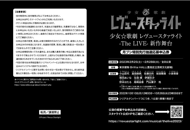 大好評の月ブシシリアルでは、2023年2月25日(土)より開演する「少女☆歌劇 レヴュースタァライト -The LIVE-新作舞台」に申し込むことができます。