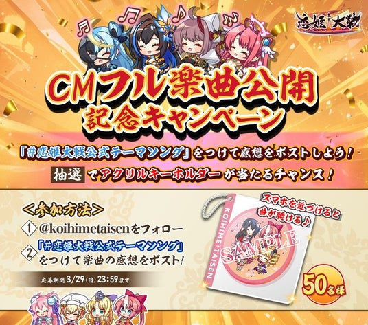 合同会社EXNOA(本社:東京都港区、CEO:東條 寛、URL:https://games.dmm.com/)が運営するDMM GAMESは、「恋姫シリーズ」初となる全シリーズ集結の新作タイトル『恋姫†大戦』にて、公式テーマソング「恋姫†集合☆いっせーのっせ!」フルバージョンの公開を記念して「オリジナルNFCアクリルキーホルダー」が抽選でもらえるキャンペーンが公式Xアカウント(https://x.com/koihimetaisen)にて開始したことをお知らせします。