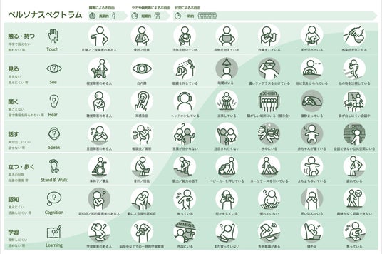 様々な制約について、一時的に誰にでも起こりうるシチュエーションを例示することで、開発者が自分事として捉えやすくするためのツールです。左端の、障害などで長期的に制約のある人との対話から解決したアイデアが、右側の様々な一時的な制約の人にも拡げられることを視覚的に理解できるため、製品企画時に検討しやすくなります。