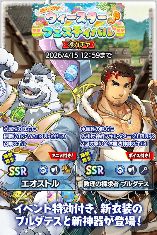SSR魂友「数理の探求者 ブルダテス」とSSR神器「エオストル」が入手可能な期間限定の「HAPPYウィースター♪フェスティバル」ガチャが登場!