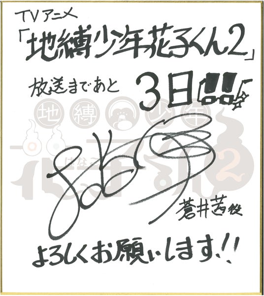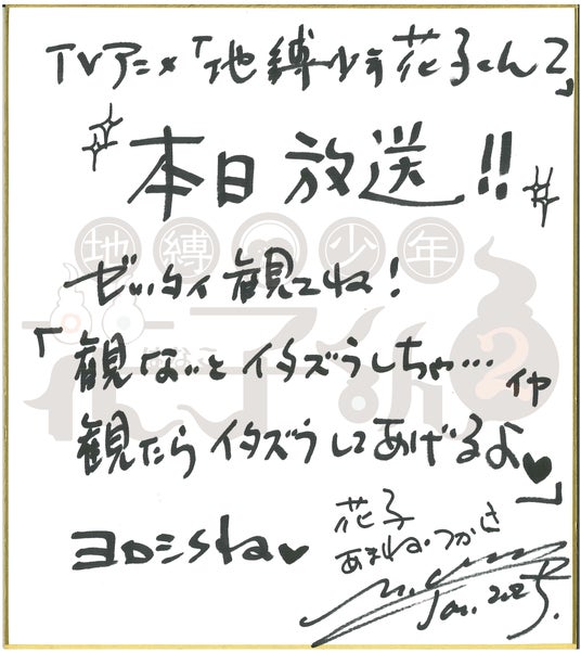 公式X(@hanakokun_info)では放送に向けた「カウントダウン」企画が1月6日(月)から1月12日(日)まで実施。原作のあいだいろをはじめ、福井洋平(監督)、伊藤麻由加(キャラクターデザイン)、緒方恵美(花子くん・つかさ役)、鬼頭明里(八尋寧々役)、千葉翔也(源 光役)、土岐隼一(蒼井 茜役)からのカウントダウンイラストやメッセージを公開した。