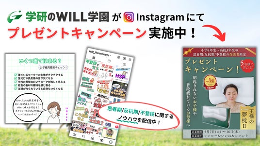 株式会社 学研ホールディングス(東京・品川/代表取締役社長:宮原博昭)のグループ会社、株式会社 学研エル・スタッフィング(本社:東京都豊島区、代表取締役:伊藤弘雅)は、学研のフリースクール・サポート校【WILL学園】の公式Instagramアカウントにて2024年5月7日(火)から2024年5月16日(木)の10日間、“安眠枕”が抽選で5名様に当たるプレゼントキャンペーンを開始しました。