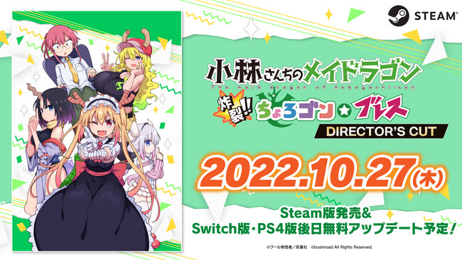 株式会社ブシロード(本社:東京都中野区、代表取締役社長:木谷 高明、以下ブシロード)は、大人気コミックス<小林さんちのメイドラゴン>の公式ゲーム『小林さんちのメイドラゴン 炸裂!!ちょろゴン☆ブレス DIRECTOR'S CUT』(以下、ちょろブレ)をSteam(R)で配信を開始したことをお知らせいたします。