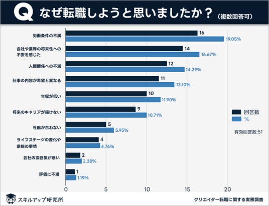 クリエイターへ転職をする人は、どのような理由で転職したのか、転職後に改善されたことは何か等の実態を解明するべく、スキルアップ研究所ではクリエイターへの転職に関する実態調査を実施した。
