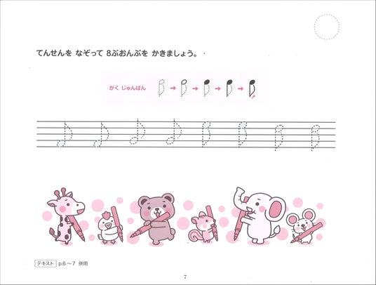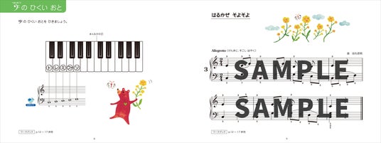 カリキュラムの最大の特徴は〈高音部記号=ト音記号からはじまる〉、つまり「ハイC」=鍵盤の中央より少し右寄りの音域(音名は二点ハ、c²)を中心に、両手ともト音記号の音域を拡げていく、ということです。「ぴあのどりーむ」シリーズと異なるこのアプローチは、メロディラインが書かれることが多いト音記号の譜読みを重要視しており、ピアノに限らず歌曲やほかのメロディ楽器(たとえばヴァイオリンなど)にも応用でき、より生活の中での音楽が楽しめるものとなっています。そしてもちろん、子どもたちにとってピアノ・レッスンが「無理がないこと」「楽しいこと」となるよう、カリキュラムはゆるやかに組まれ、「ピアノを弾くこと」の楽しさを存分に味わえるよう考え抜かれています。