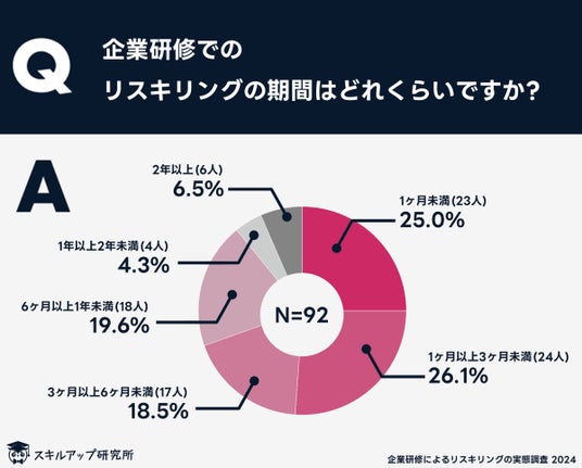 企業研修でのリスキリングの期間を尋ねたところ、「1ヶ月以上3ヶ月未満」の回答が24人(26.1%)と最も多く、次いで「1ヶ月未満」の回答が23人(25.0%)となった。