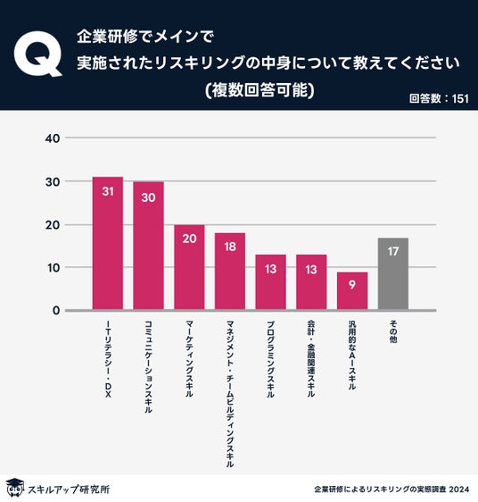 企業研修でメインで実施されたリスキリングの中身については、「ITリテラシー・DX」(31票)が最多となり、次いでコミュニケーションスキル(30票)となった。