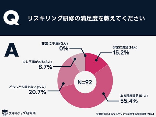 リスキリング研修に対する満足度を尋ねたところ、「非常に満足」との回答が14人(15.2%)で「ある程度満足」との回答が51人(55.4%)となった。「非常に満足」と「ある程度満足」を足し合わせた割合は7割を超えた。