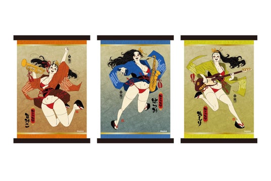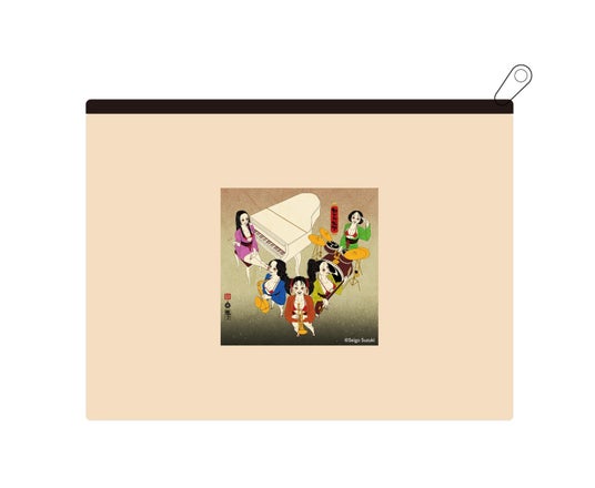 ヴィレッジヴァンガードはジャズと縁があるようで、この5人の女の子たちはそれぞれ楽器を持ち、ヴィレッジヴァンガード店舗のジャズBGMを演奏している様子をイメージしました。5人が着ている着物の柄にヴィレッジヴァンガードのロゴの一部を使用しているところがポイントです。